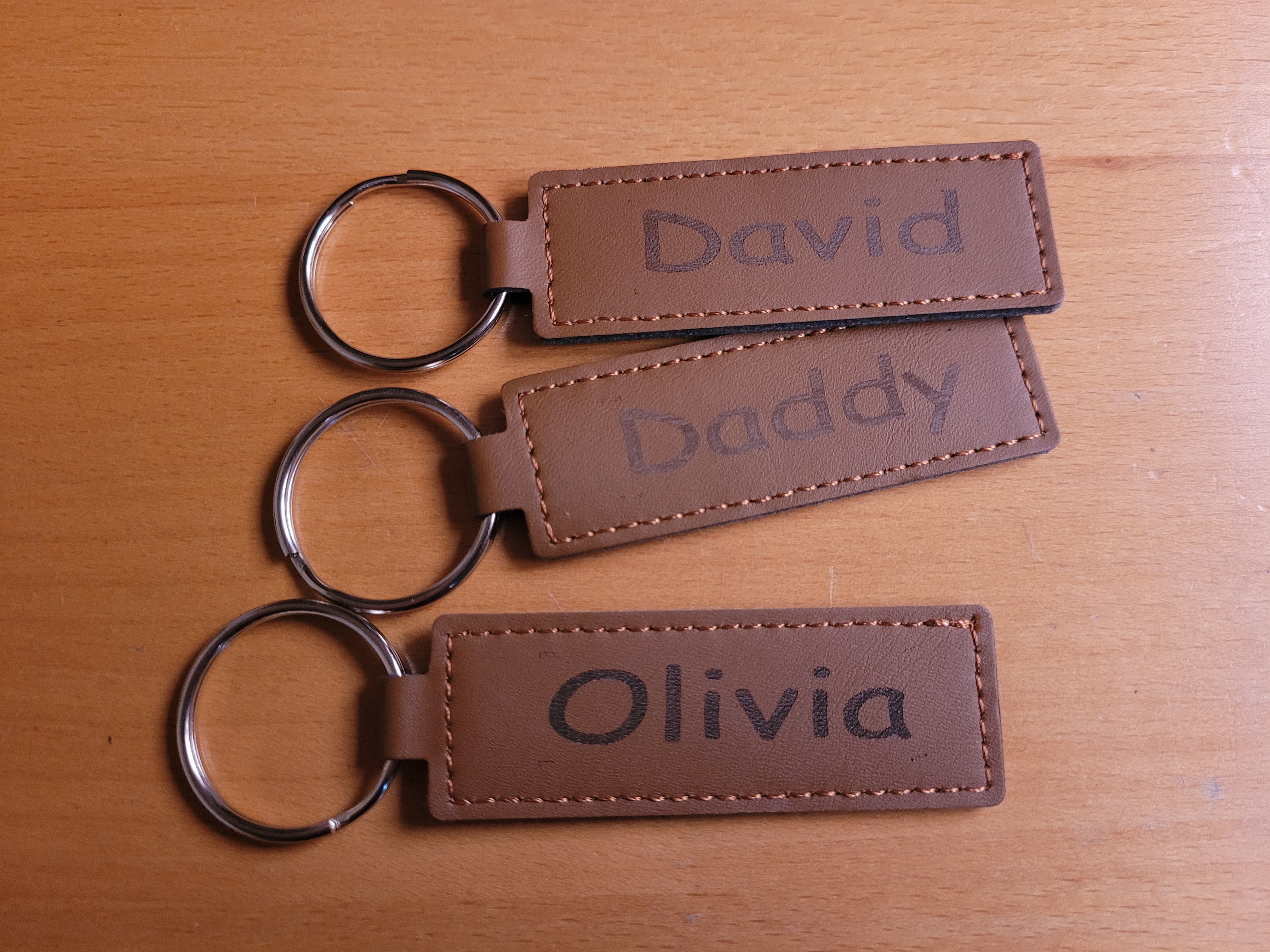 The faux leather material offers a smooth, leather-look finish while remaining durable and lightweight. Due to the engraving process and the nature of the material, the engraved result may vary slightly in tone and depth, giving each keyring its own unique character.